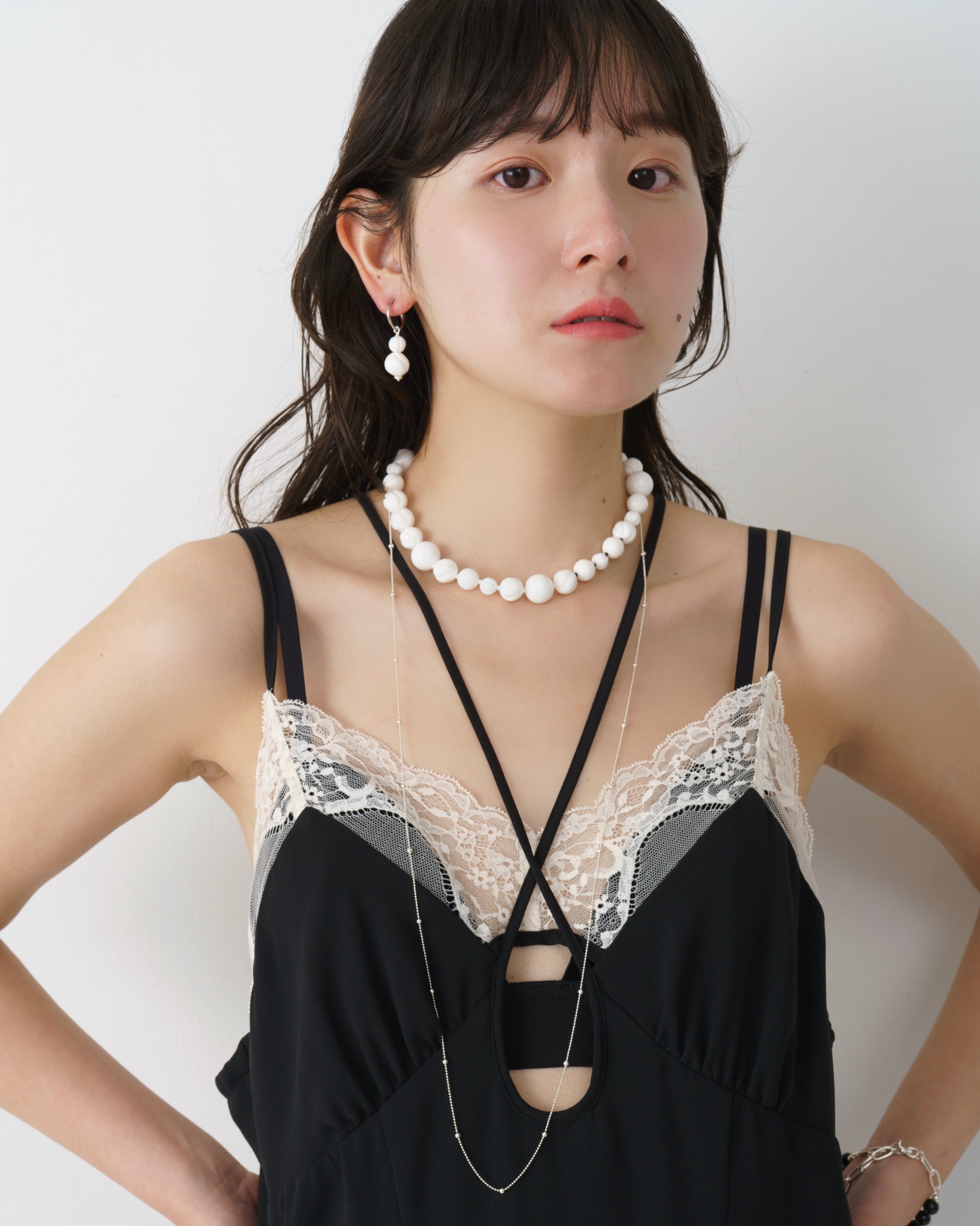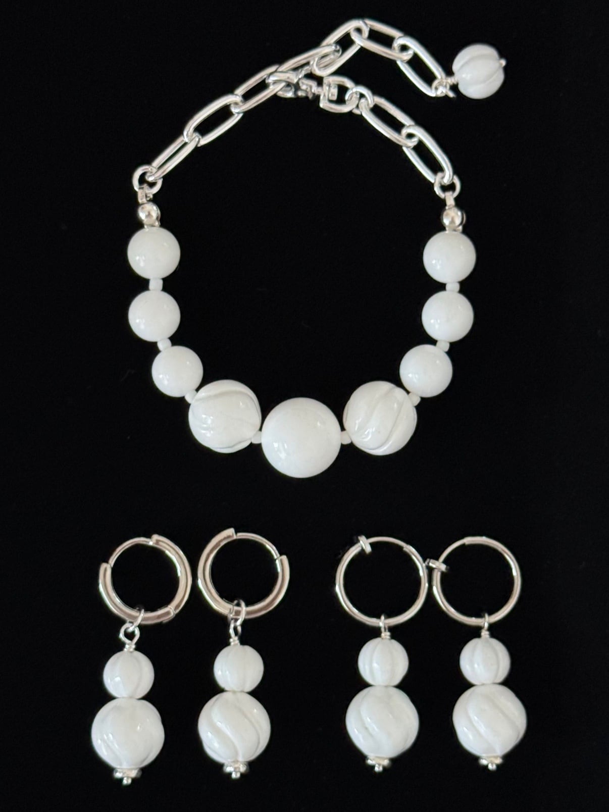異なる大きさのshellとwhite onyx beadsを組み合わせました●⚫︎●⚫︎●