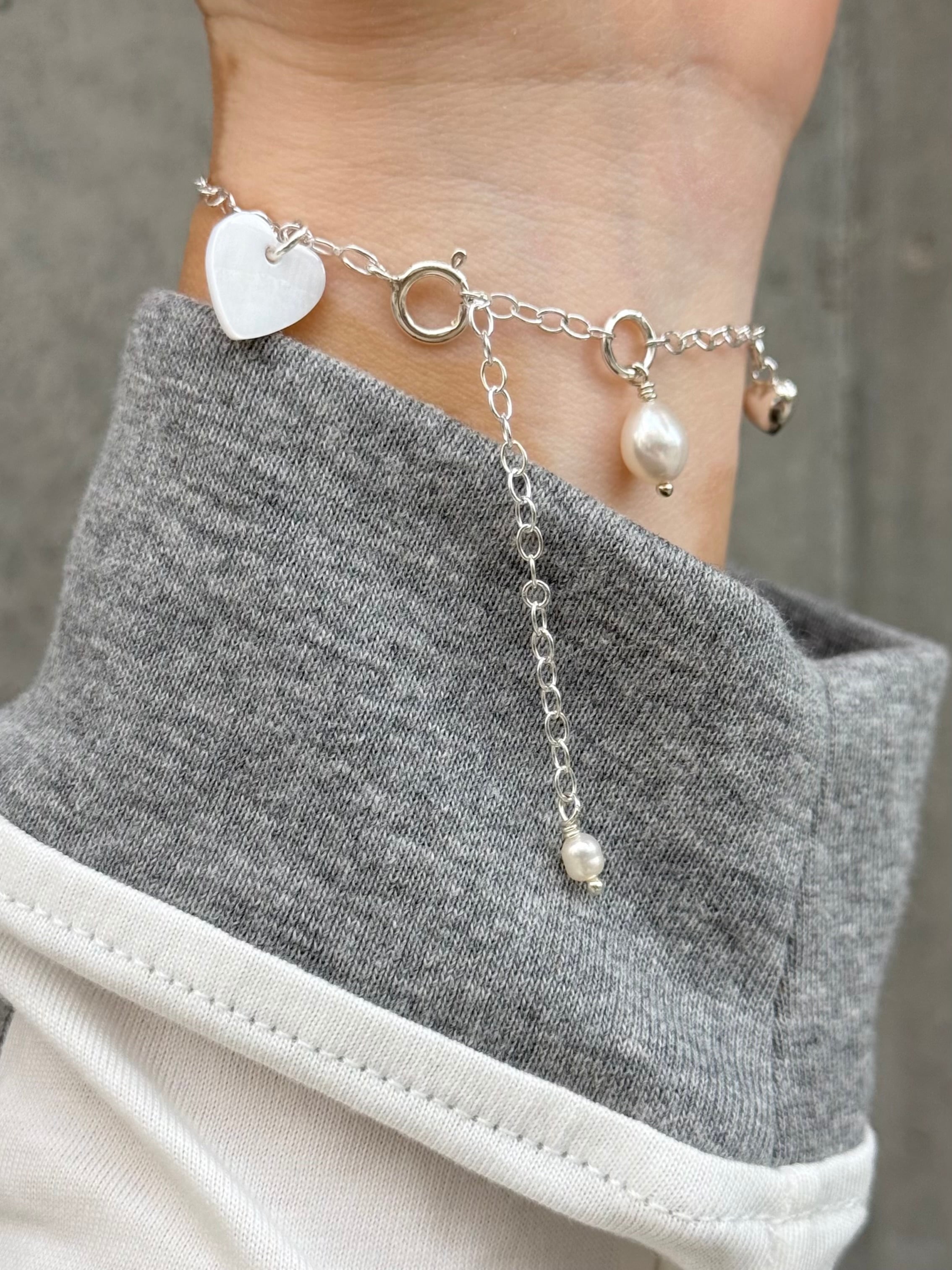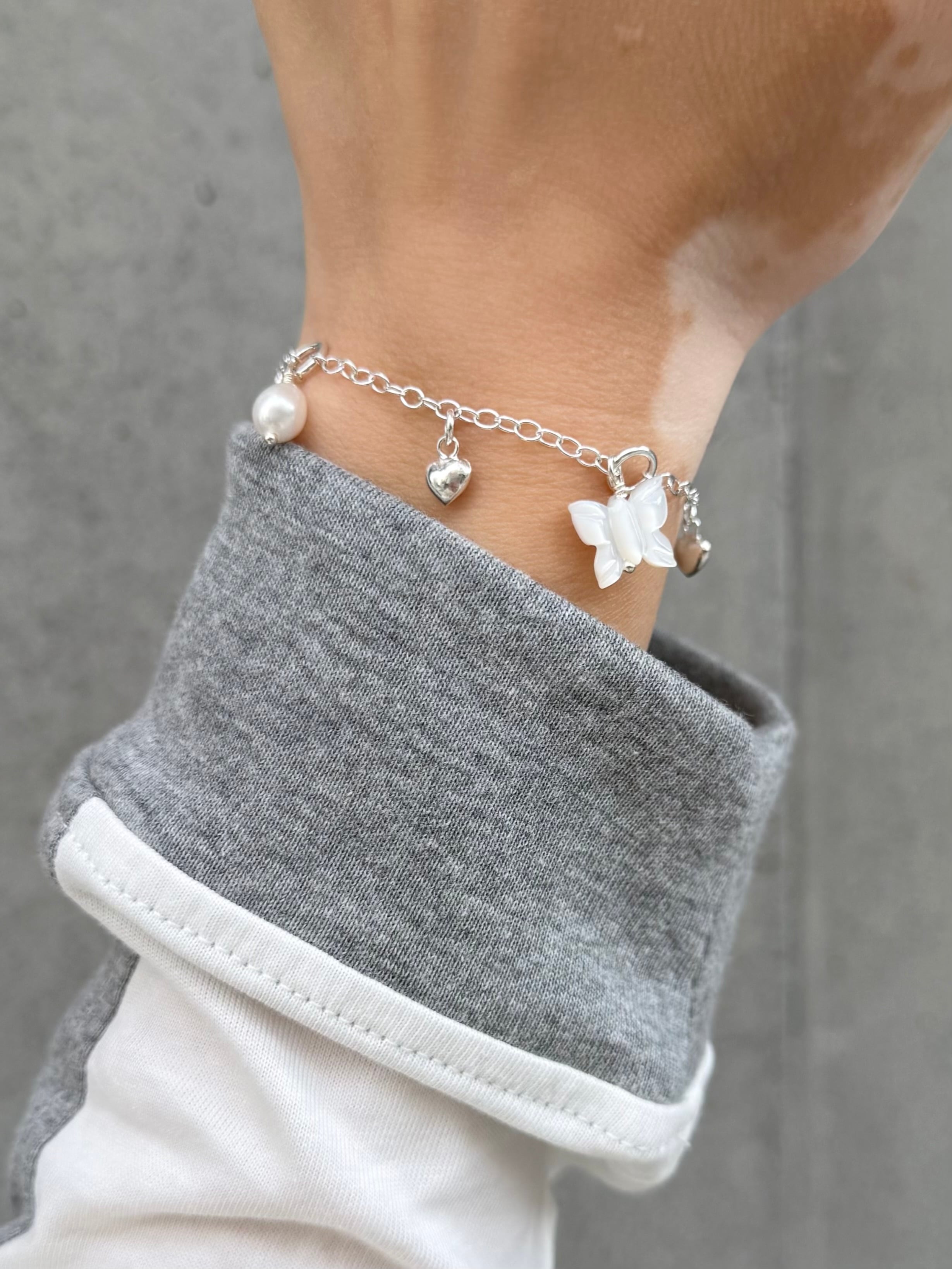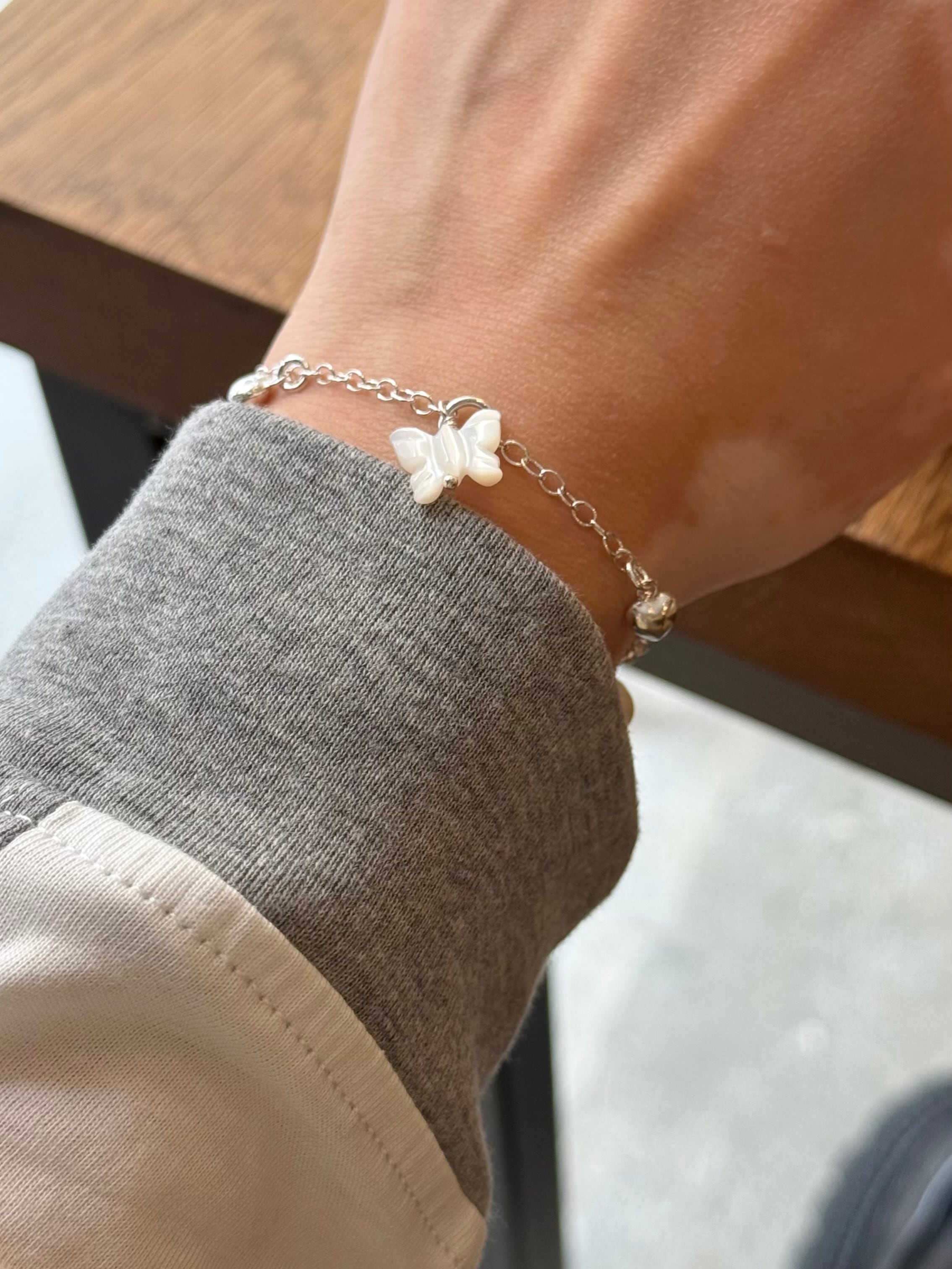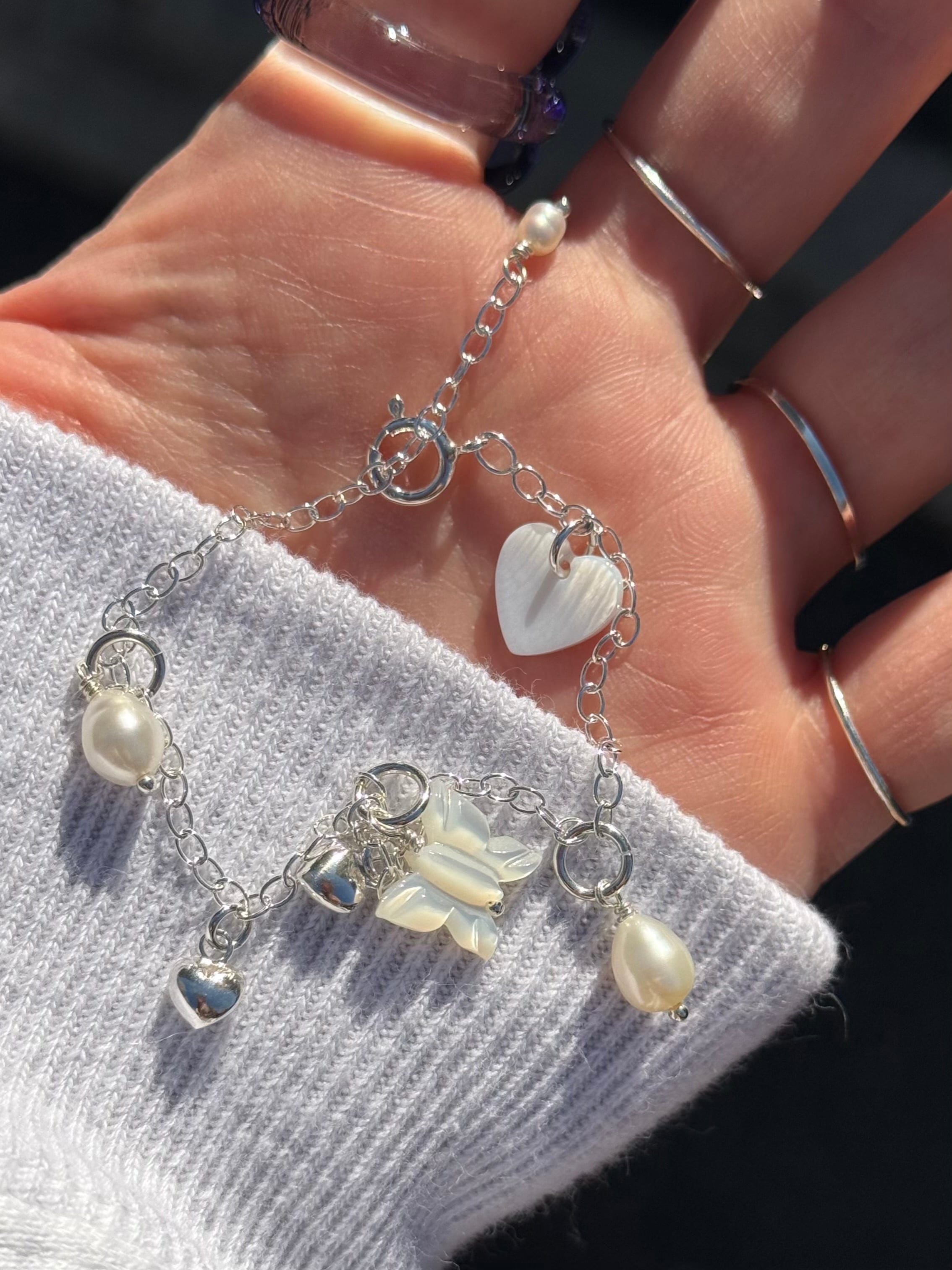 貝から一つ一つ手彫りされたハートと蝶々モチーフを華奢なchainに散りばめたbraceletです.ᐟ
