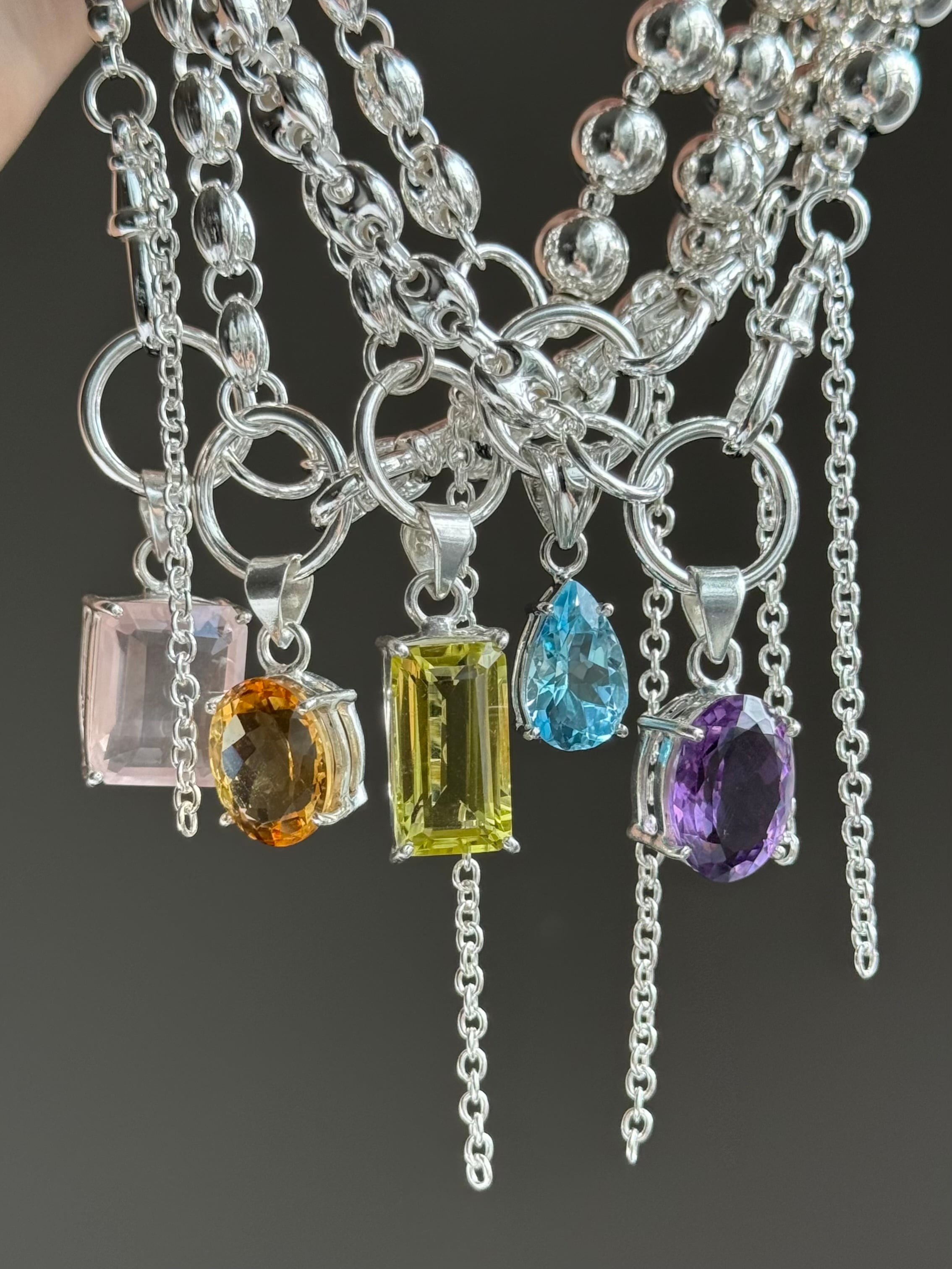 ローズクォーツ、シトリン、レモンクウォーツブルートパーズ、アメジストは天然ものとなります。