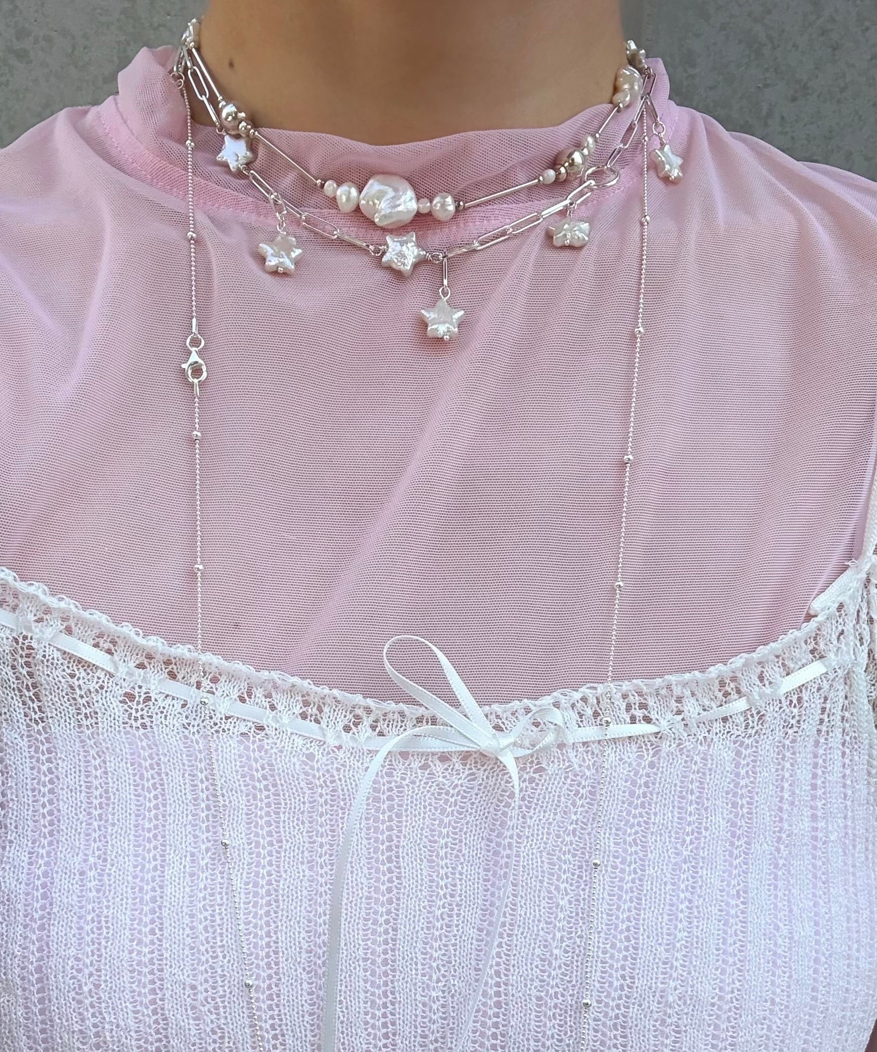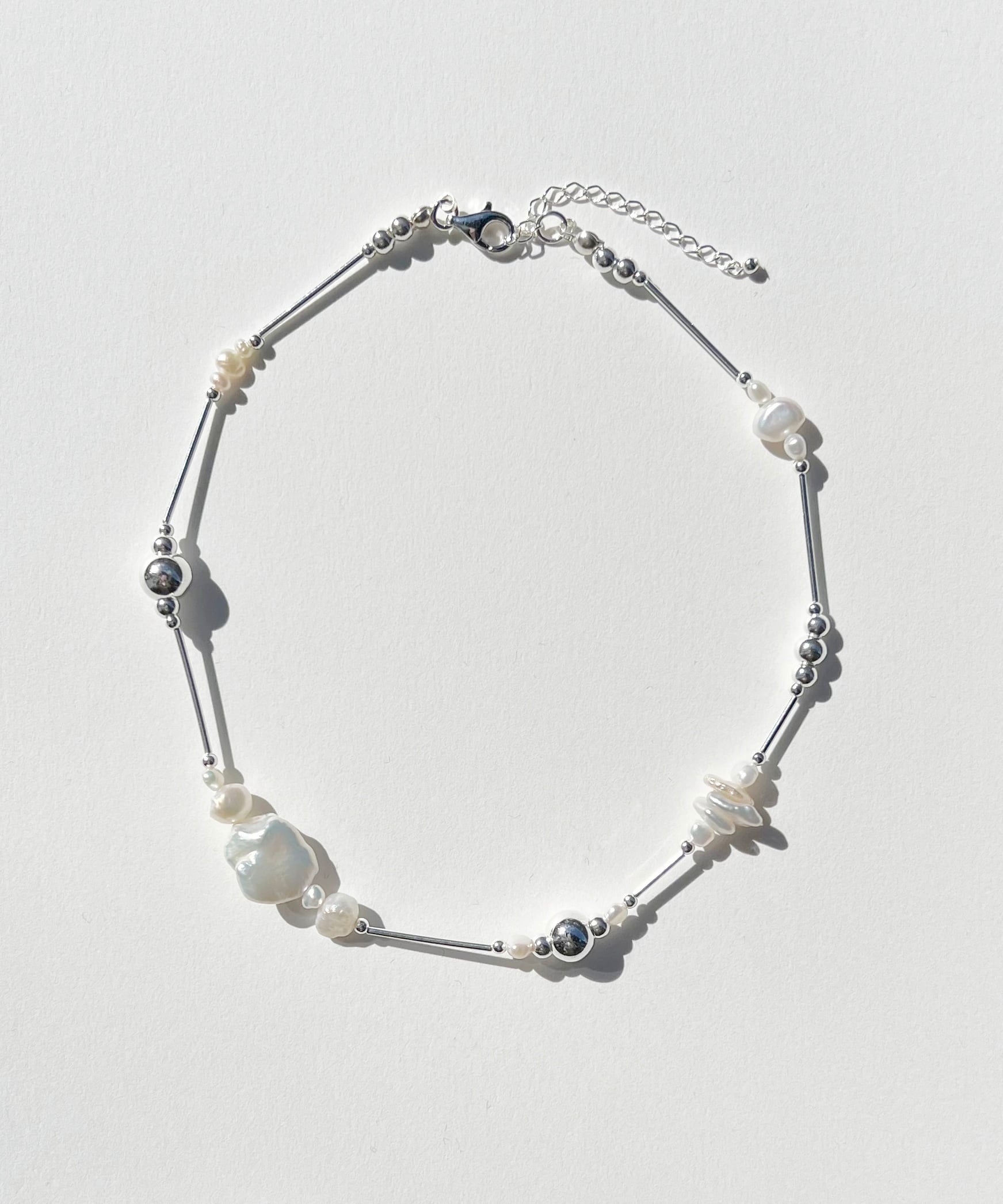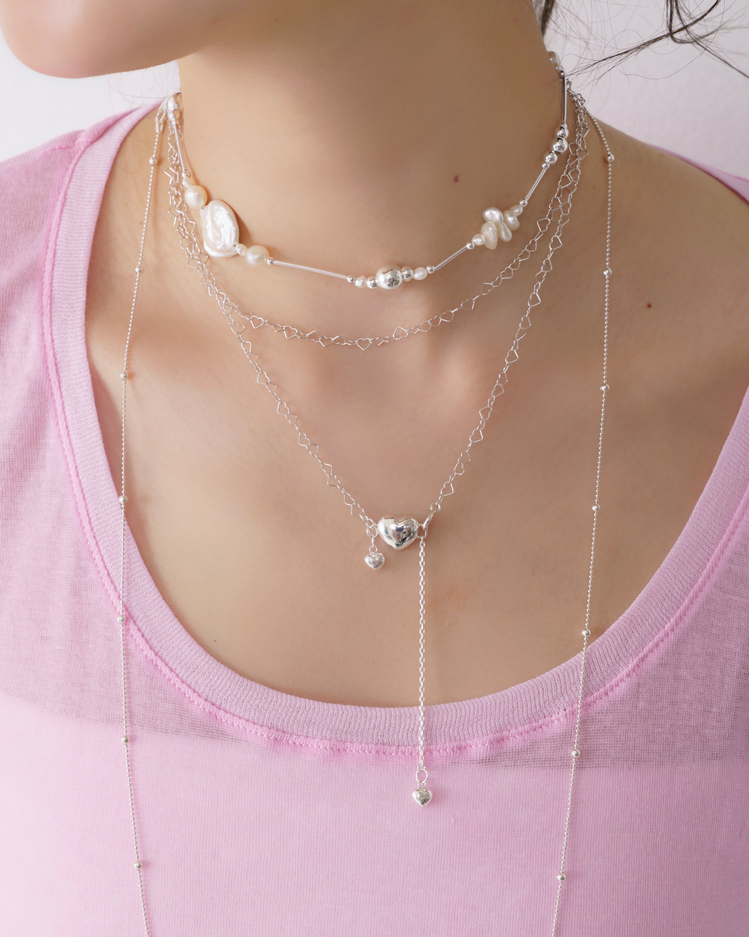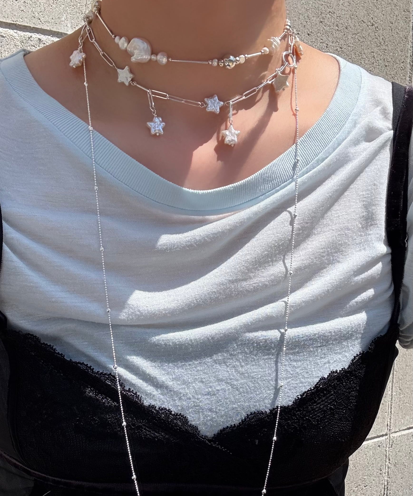 様々な大きさのballbeadsとpearl組み合わせたnecklace。